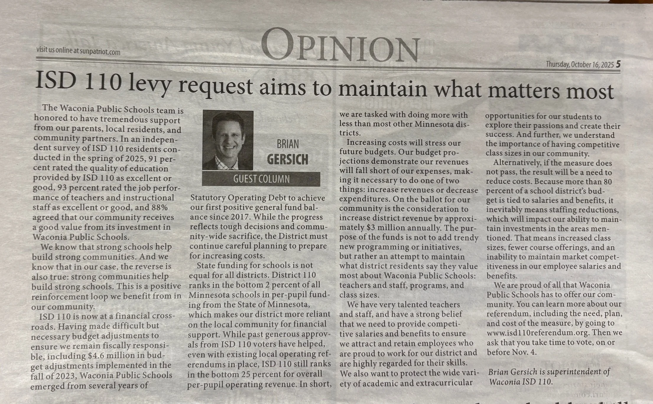 We are proud of all that Waconia Public Schools has to offer our community. You can learn more about our referendum, including the need, plan, and cost of the measure, by going to www.isd110referendum.org. Then we ask that you take time to vote, on or before November 4.
